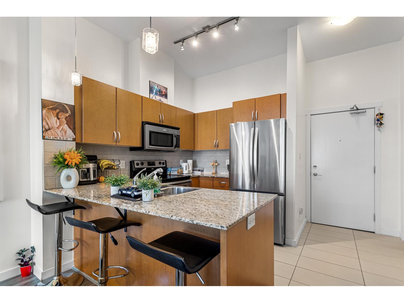 Welcome to The Quattro - a bright, top-floor two bedroom home that offers space, privacy, and exceptional long-term value in the heart of Surrey's rapidly growing City Centre. This well-laid-out residence features soaring 10-foot ceilings, a clean open-concept design with no wasted space, and a quiet north-facing exposure overlooking the inner courtyard. Natural light fills the living area while maintaining a calm, private feel, making it equally appealing for comfortable daily living or as a smart investment property. The home has been thoughtfully updated with three-year-old flooring, stainless steel appliances, a new refrigerator, and large windows that were replaced throughout the building in 2024. The kitchen flows seamlessly into the living and dining area, while the deep soaker tub and in-suite laundry add everyday comfort. A generous covered patio extends your living space outdoors, and the balcony upgrade has already been completed and paid for by the seller. The Quattro is a rental-friendly and pet (id:9345)...